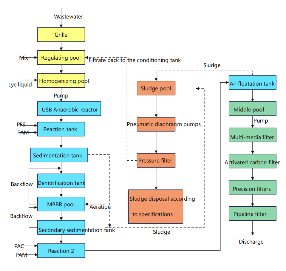 Hydrolytic acidification can transform non-soluble organic matter in wastewater into soluble organic matter, and transform large-molecule organic matter that is difficult to biodegrade into small-molecule organic matter that is easy to biodegrade, and improve the biochemical properties of wastewater. The MBBR process relies on the adsorption and coagulation, oxidation and decomposition, and conversion and synthesis of organic matter in the wastewater by the bacterial colloids attached to the suspension filler, which can effectively degrade the CODCr and BOD5 of the wastewater. and convert ammonia nitrogen into nitrate nitrogen. The MBBR process can avoid the sludge expansion and sludge loss during the operation. The MBR process can maintain a high biomass in the biochemical treatment facility and has a high tolerance to shock load and water quality changes, and the effluent quality of MBR is significantly better than that of other methods.