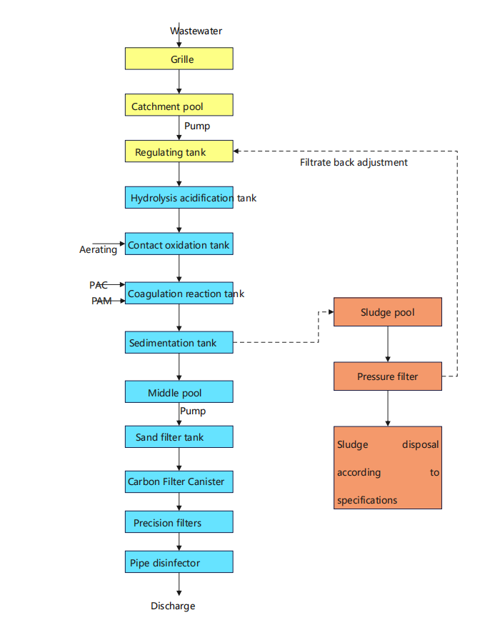 The physical treatment adopts coagulation and sedimentation process to further remove suspended matter and organic matter from the effluent of contact oxidation tank and reduce CODCr, BOD5 and TP of the wastewater through coagulation and sedimentation.