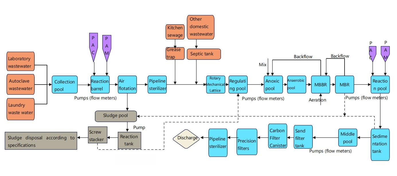 Laboratory wastewater, autoclave wastewater and laundry/surgical room wastewater are collected separately and pretreated (coagulation air floatation + UV killing), then combined with kitchen wastewater pretreated by grease trap and other wastewater pretreated by septic tank and fed into wastewater conditioning tank through rotary type for grating to intercept and remove dirt, then anoxic - aerobic biochemical treatment of wastewater, aerobic section adopts MBBR process and MBR process. It can effectively reduce and remove BOD5, CODCr and NH3-N. By returning the mixture of MBBR tank to the anoxic section, it can effectively reduce and remove TN. The deep treatment of wastewater by mechanical filter, activated carbon filter, precision filter and pipeline sterilizer can ensure that the suspended matter, turbidity and fecal coliform bacteria of discharged water can meet the discharge requirements.